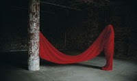 'Transhumance II' es una imagen muy cuidada y de equilibrio en la composición donde destacan una corporeidad casi escultórica y una potente verticalidad. En primer plano, una columna desconchada y un cuerpo esbelto, unidos por la tela roja. La austera escenografía, la iluminación tenebrosa y el color vivo del centro recrean la atmósfera silenciosa, intimista y desconcertante que caracteriza la obra de la artista madrileña.