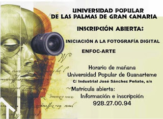 Canarias.- Un año más se convocan los talleres de fotografía de la Universidad Popular de Las Palmas. "Iniciación a la fotografía digital" proporcionará unos conocimientos básicos sobre la creación de imágenes digitales, siendo un taller tecnológico en cuanto a sus contenidos. "Enfoc-arte", en cambio, pretende crear un punto de encuentro entre aficionados y profesionales de la fotografía, haciendo mayor hincapié en la reflexión, el análisis y la práctica del medio fotográfico. Más información en el siguiente teléfono 928 27 00 94.