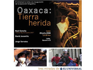 La muestra fotográfica estará integrada por instantáneas de Raúl Estrella (premio Rey de España 2007), David Jaramillo y Jorge SerratoMexico.- El próximo lunes 28 de julio se llevará a cabo la exposición fotográfica Oaxaca: Tierra Herida, la cual incluirá imágenes de esa entidad captadas por reporteros gráficos de EL UNIVERSAL.